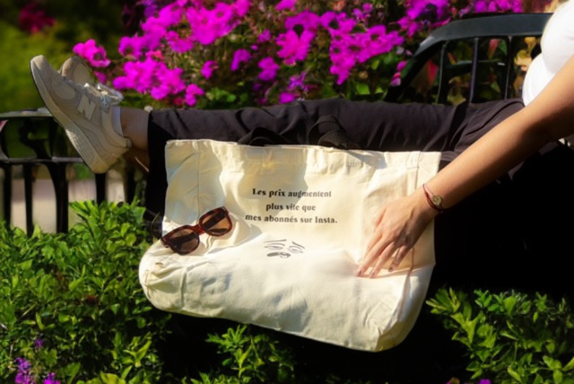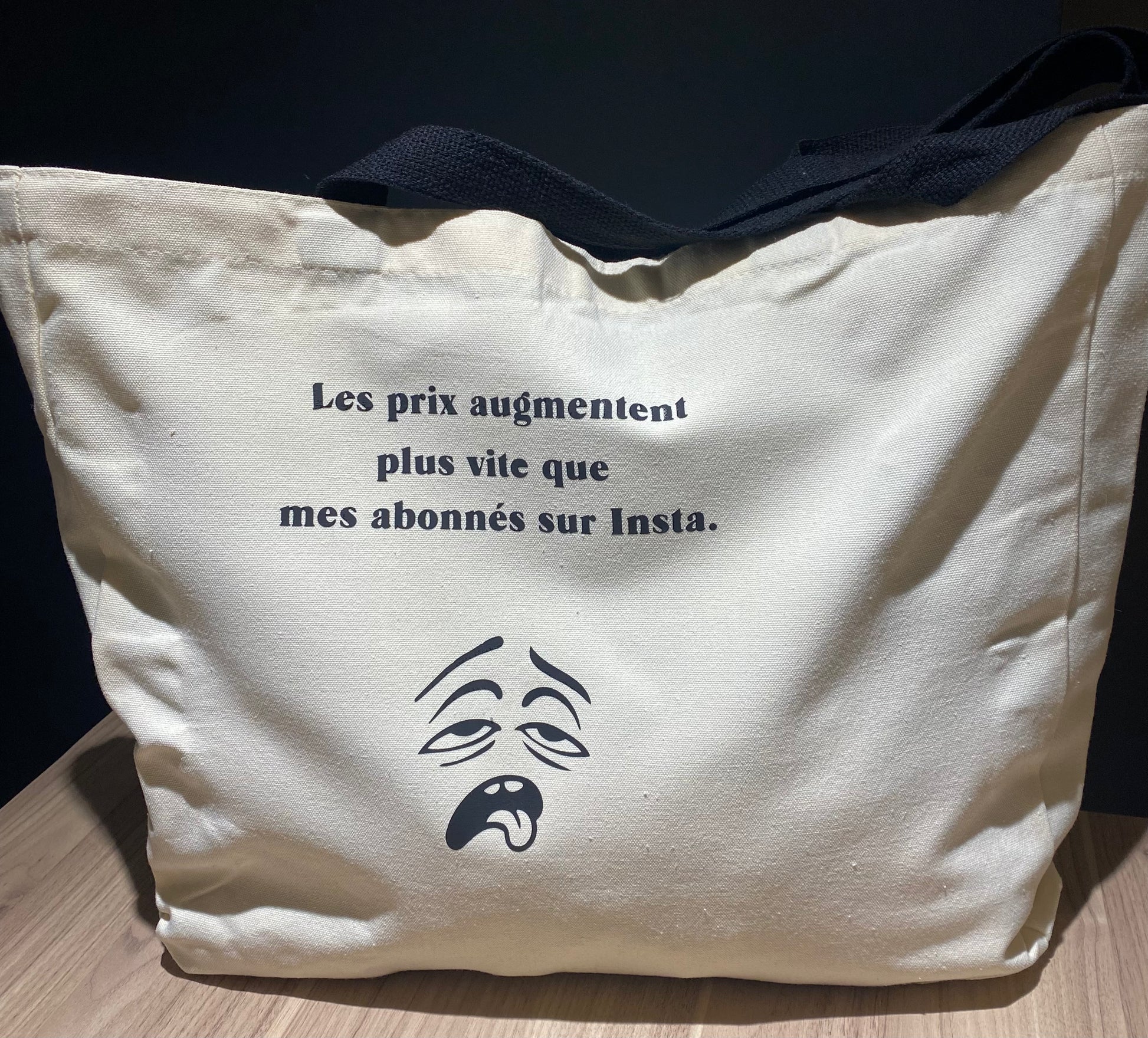 Imaginez un tote bag oversize chic et pratique, arborant un message à la fois humoristique et pertinent : "Les prix augmentent bien plus que mes abonnés Insta".