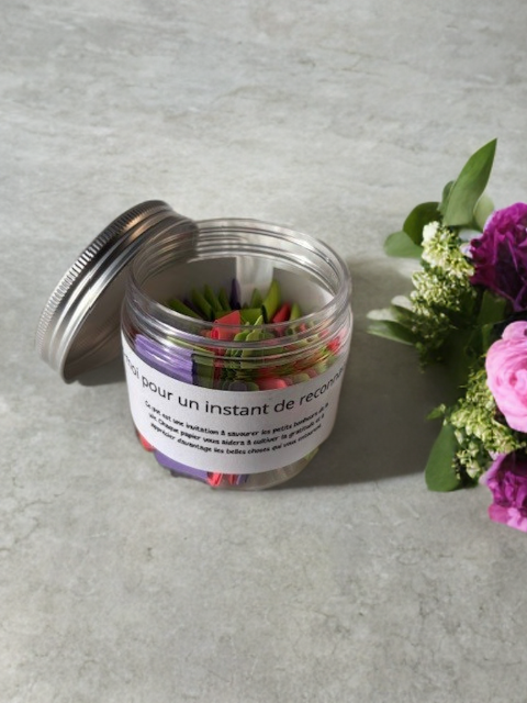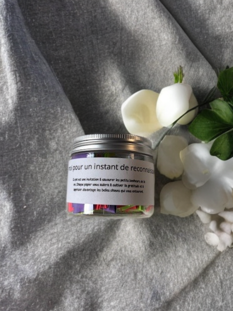 Ce pot t’aide à cultiver un regard positif sur la vie, en te reconnectant à ce qui fait du bien, même dans les choses simples. Un mot, une pensée, un sourire intérieur : chaque message est une invitation à dire merci, sans raison particulière… juste parce que ça fait du bien. 🌸